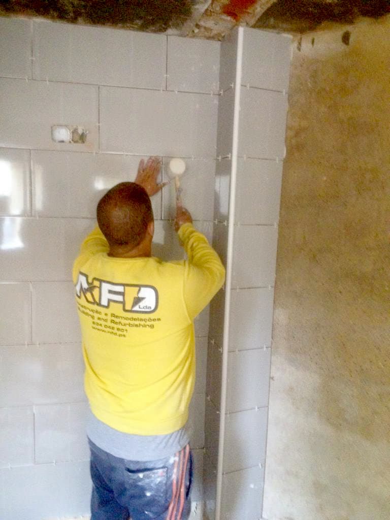 Instalação de sanitários, revestimento das repetivas paredes a azulejo.